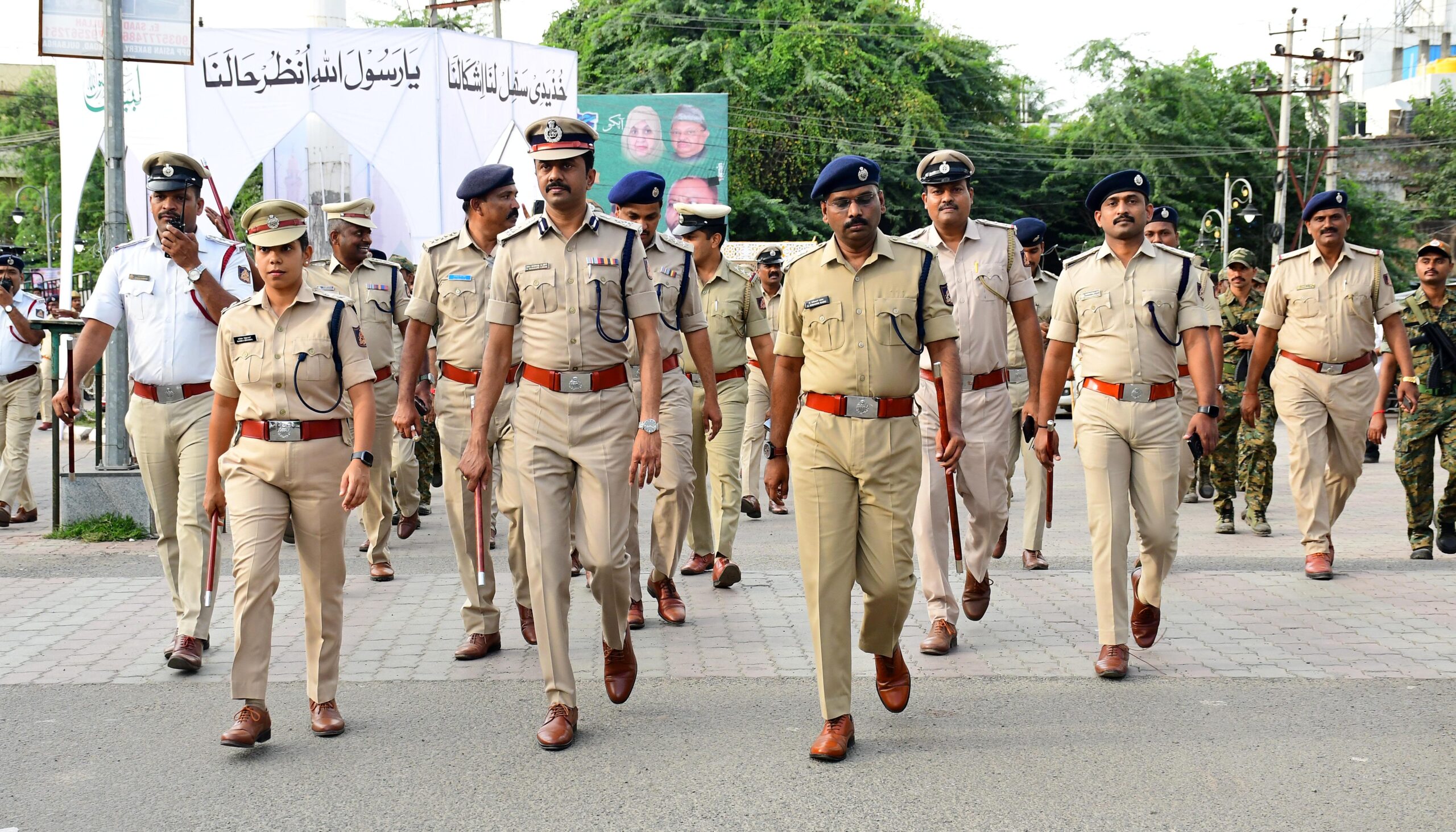 ಕಲಬುರಗಿ : ಗಣೇಶ ಉತ್ಸವ ಹಾಗೂ ಈದ್ ಮಿಲದ್ ಉನ್ ನಬೀ ಹಬ್ಬದ ಹಿನ್ನೆಲೆಯಲ್ಲಿ ನಗರದ ಹಿಂದೂ ಮಹಾ ಗಣಪತಿ ಪ್ರತಿಷ್ಠಾಪನೆಯಾದ ಸ್ಥಳದಿಂದ ಕಲಬುರಗಿ ಪೊಲೀಸ್ ಆಯುಕ್ತ ಡಾ. ಶರಣಪ್ಪ ಎಸ್ ಡಿ ಅವರು ಎಲ್ಲಾ ಪೊಲೀಸ್ ಅಧಿಕಾರಿ ಹಾಗೂ ಸಿಬ್ಬಂದಿಯವರೊಂದಿಗೆ ನಗರದ ಪ್ರಮುಖ ರಸ್ತೆಗಳಾದ ಹುಮನಾಬಾದ ಬೆಸ್, ಮುಸ್ಲೀ ಚೌಕ್, ಹಪ್ತ ಗುಮಾಜ್, ಸಂತ್ರಸ್ ವಾಡಿ, ಸೇರಿದಂತೆ ಮುಖ್ಯ ರಸ್ತೆಗಳ ಮೂಲಕ ಜಗತ್ ವೃತ್ತದ ವರಗೆ ಪೊಲೀಸ್ ರೂಟ್ ಮಾರ್ಚ್ ನಡೆಸಿದರು. ಈ ಸಂದರ್ಭದಲ್ಲಿ ಎಸ್.ಪಿ ಮತ್ತು ಪ್ರಿನ್ಸಿಪಾಲ್ ಪೊಲೀಸ್ ತರಬೇತಿ ಕಾಲೇಜು ಕಲಬುರಗಿಯ ಕಿಶೋರ ಬಾಬು, ಡಿಸಿಪಿ ಕನಿಕಾ ಸಿಕ್ರಿವಾಲ, ಸೇರಿದಂತೆ ಕಲಬುರಗಿ ನಗರ ವ್ಯಾಪಿಯ ಡಿವೈಎಸ್ಪಿ, ವಿವಿಧ ಠಾಣೆಯ ಸಿಪಿಐ ಸೇರಿದಂತೆ ಅಧಿಕಾರಿಗಳು ಇದ್ದರು.