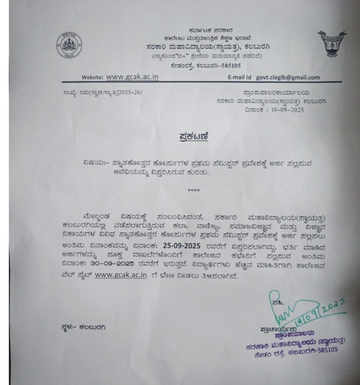 ಕಲಬುರಗಿ: ಸರ್ಕಾರಿ ಮಹಾವಿದ್ಯಾಲಯ(ಸ್ವಾಯತ್ತ)ದಲ್ಲಿ ನಡೆಸಲಾಗುತ್ತಿರುವ ಕಲಾ, ವಾಣಿಜ್ಯ, ಸಮಾಜ ವಿಜ್ಞಾನ ಮತ್ತು ವಿಜ್ಞಾನ ನಿಕಾಯಗಳ ವಿವಿಧ ಸ್ನಾತಕೋತ್ತರ ಕೋರ್ಸುಗಳ ಪ್ರಥಮ ಸೆಮಿಸ್ಟರ್ ಪ್ರವೇಶಕ್ಕೆ ಅರ್ಜಿ ಸಲ್ಲಿಸಲು ಅಂತಿಮ ದಿನಾಂಕವನ್ನು ಸೆ 25 ರವರೆಗೆ ವಿಸ್ತರಿಸಲಾಗಿದ್ದು, ಭರ್ತಿ ಮಾಡಿದ ಅರ್ಜಿಗಳನ್ನು ಸೂಕ್ತ ದಾಖಲೆಗಳೊಂದಿಗೆ ಕಾಲೇಜಿನ ಕಛೇರಿಗೆ ಸಲ್ಲಿಸುವ ಅಂತಿಮ ದಿನಾಂಕ: ೩೦-೦೯-೨೦೨೫ ರವರೆಗೆ ಇರುತ್ತದೆ. ವಿದ್ಯಾರ್ಥಿಗಳು ಹೆಚ್ಚಿನ ಮಾಹಿತಿಗಾಗಿ ಕಾಲೇಜಿನ ವೆಬ್ ಸೈಟ್ ತಿತಿತಿ.gಛಿಚಿಞ.ಚಿಛಿ.iಟಿ ಗೆ ಭೇಟಿ ನೀಡಲು ಮಹಾವಿದ್ಯಾಲಯದ ಪ್ರಾಂಶುಪಾಲರಾದ ಡಾ.ಸವಿತಾ ತಿವಾರಿ ಅವರು ತಿಳಿಸಿದ್ದಾರೆ.